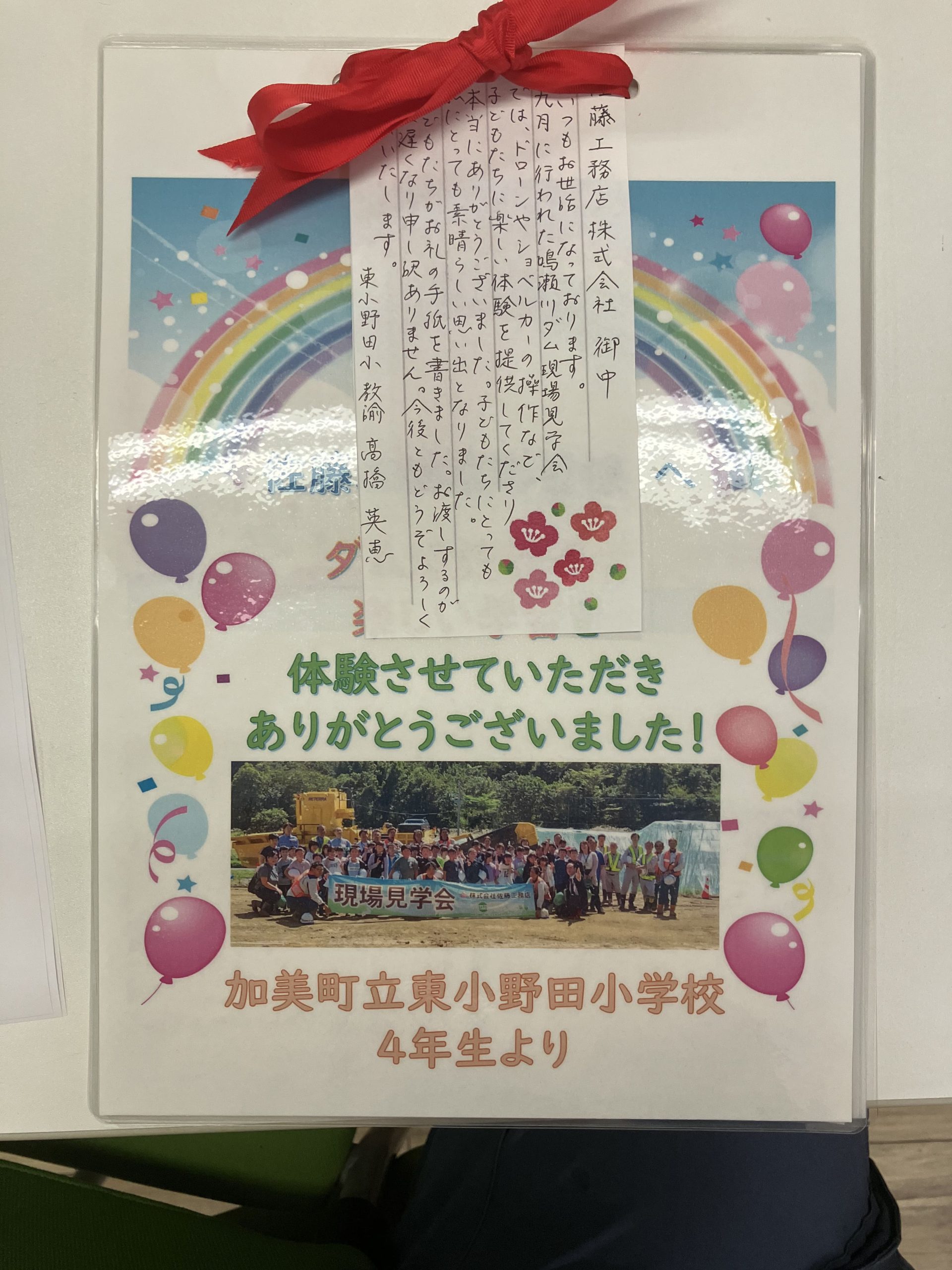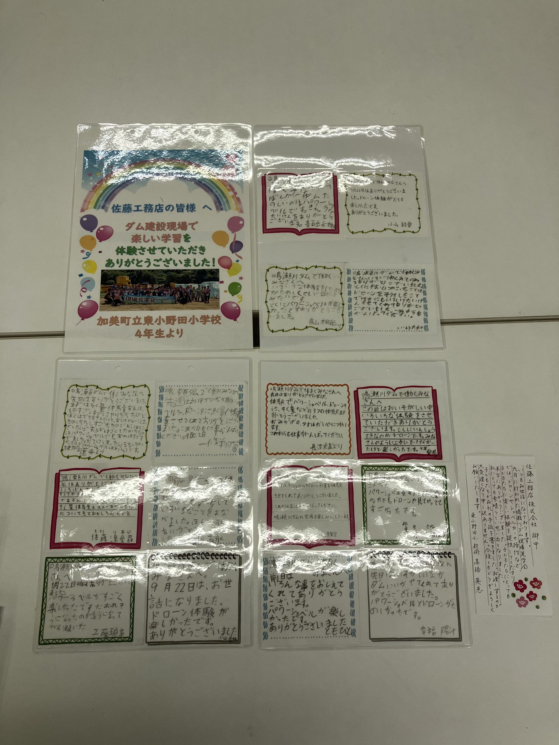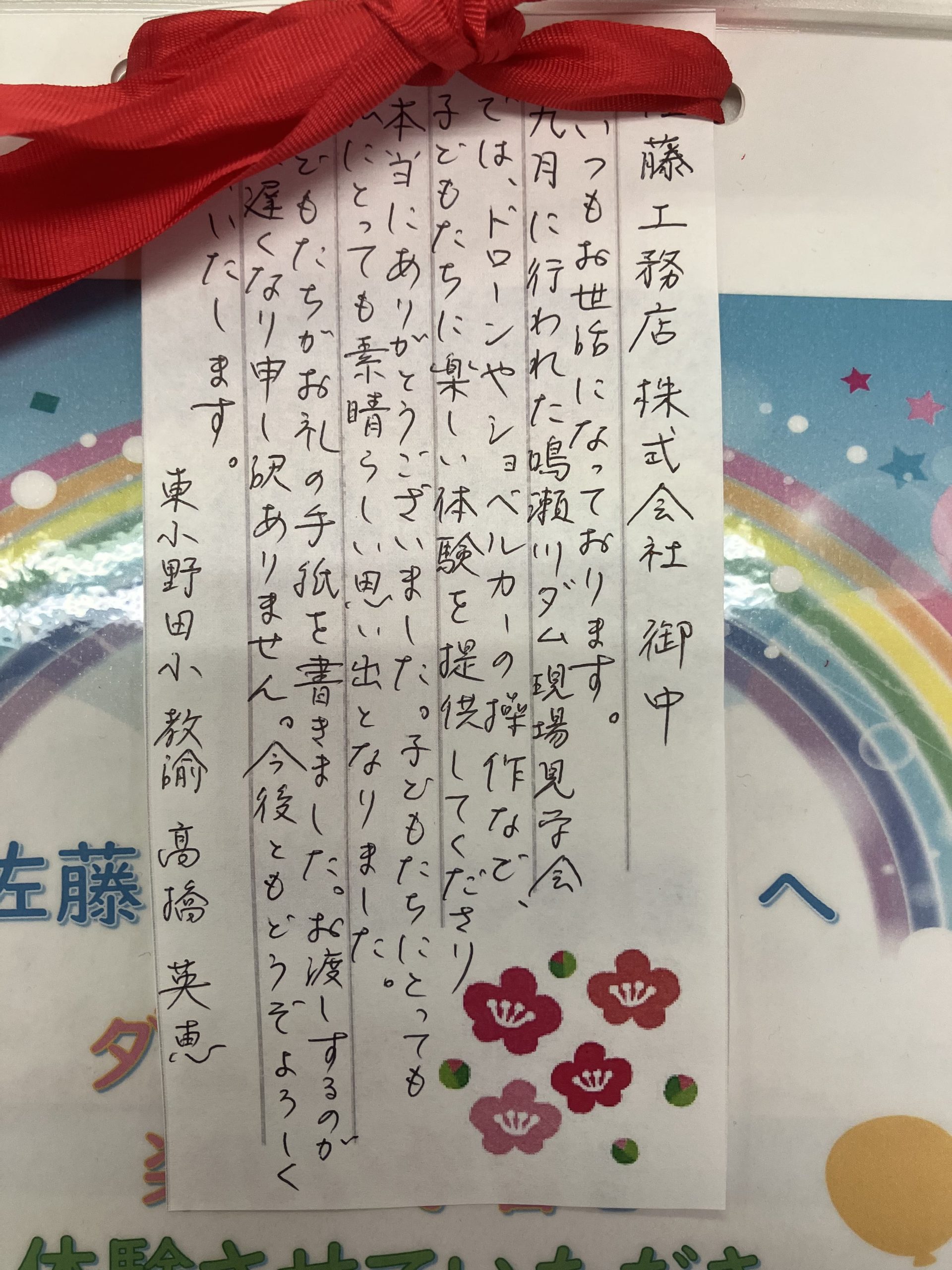 新年あけましておめでとうございます。今年もよろしくお願いします。早速ですが東小野田小学校様より9月に実施した現場見学体験型学習会の御礼のお手紙をいただきました。生徒の皆さんのメッセージもいただきました。こちらこそありがとうございます。鳴瀬川ダムはこれからが大きく進んでいく工事ですので継続して現場見学会を続けることが出来ればと思っています。